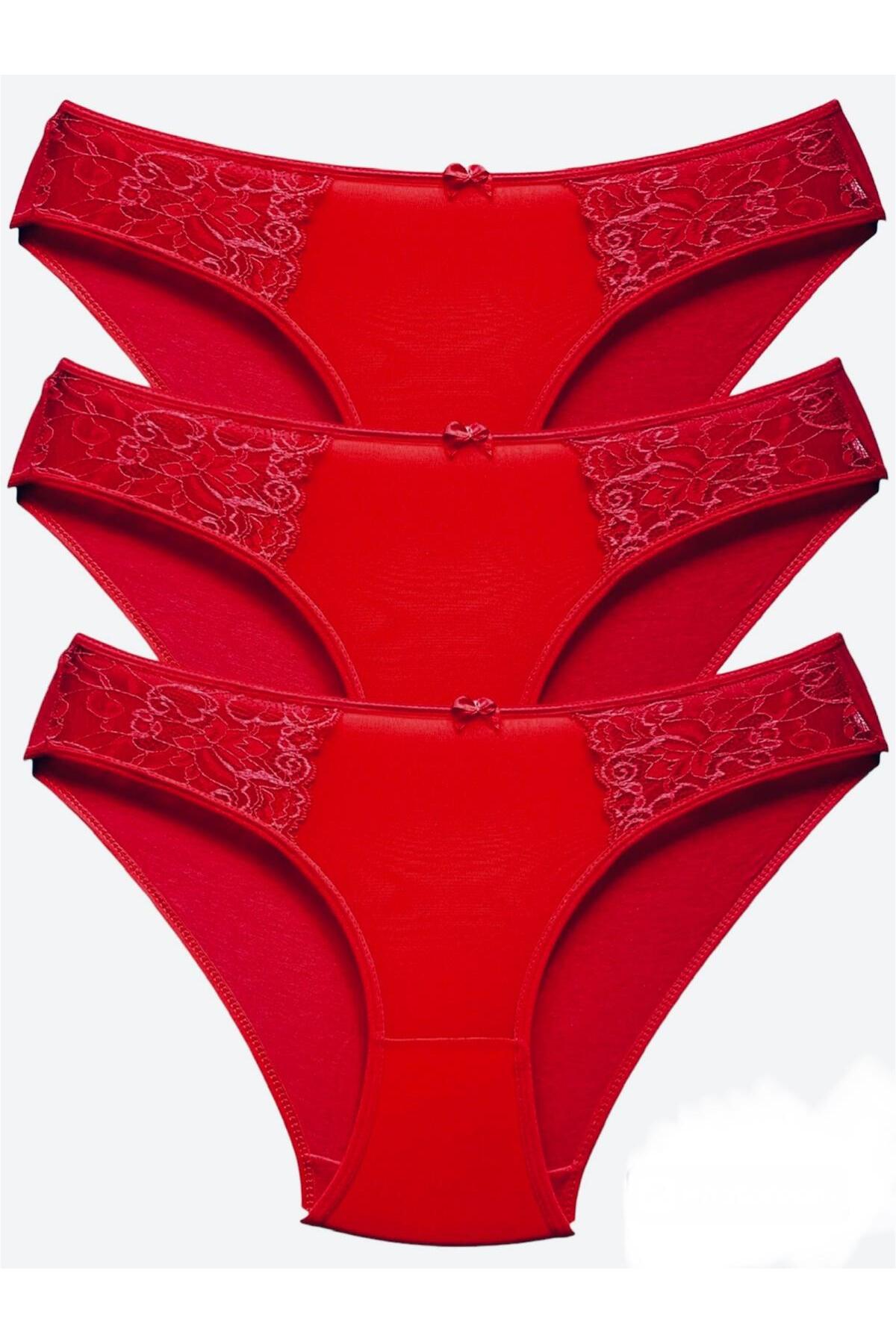 İki Yanı Dantelli Önü Tül Külot 3'lü - 3180 Kırmızı